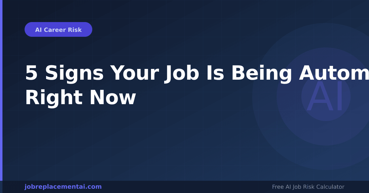 How do I know if my job is being automated? The five signs are: employer buying AI productivity tools, tasks being measured more granularly, headcount frozen while output expectations rise, junior versions of your role being restructured, and stakeholders accepting AI-produced outputs in your area.